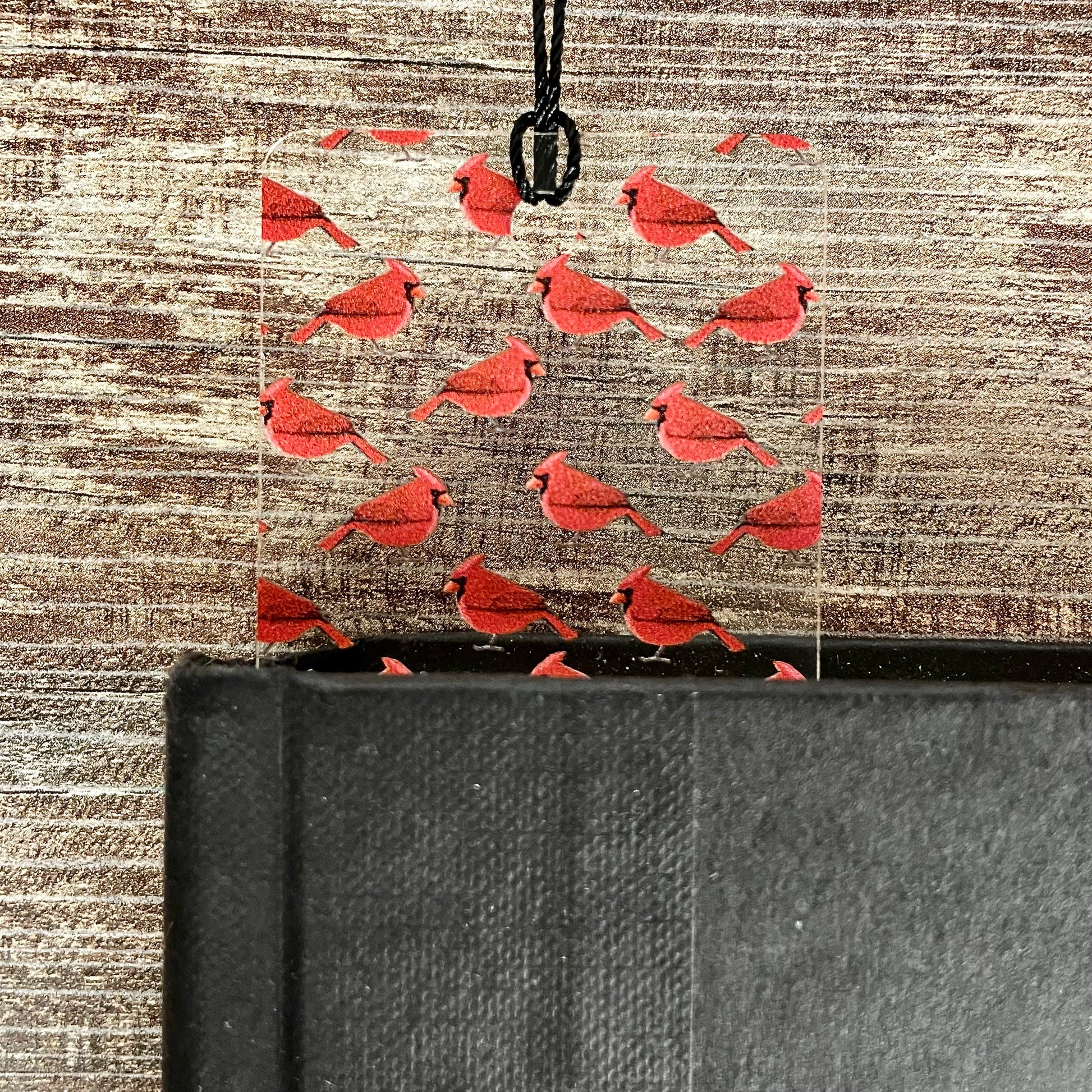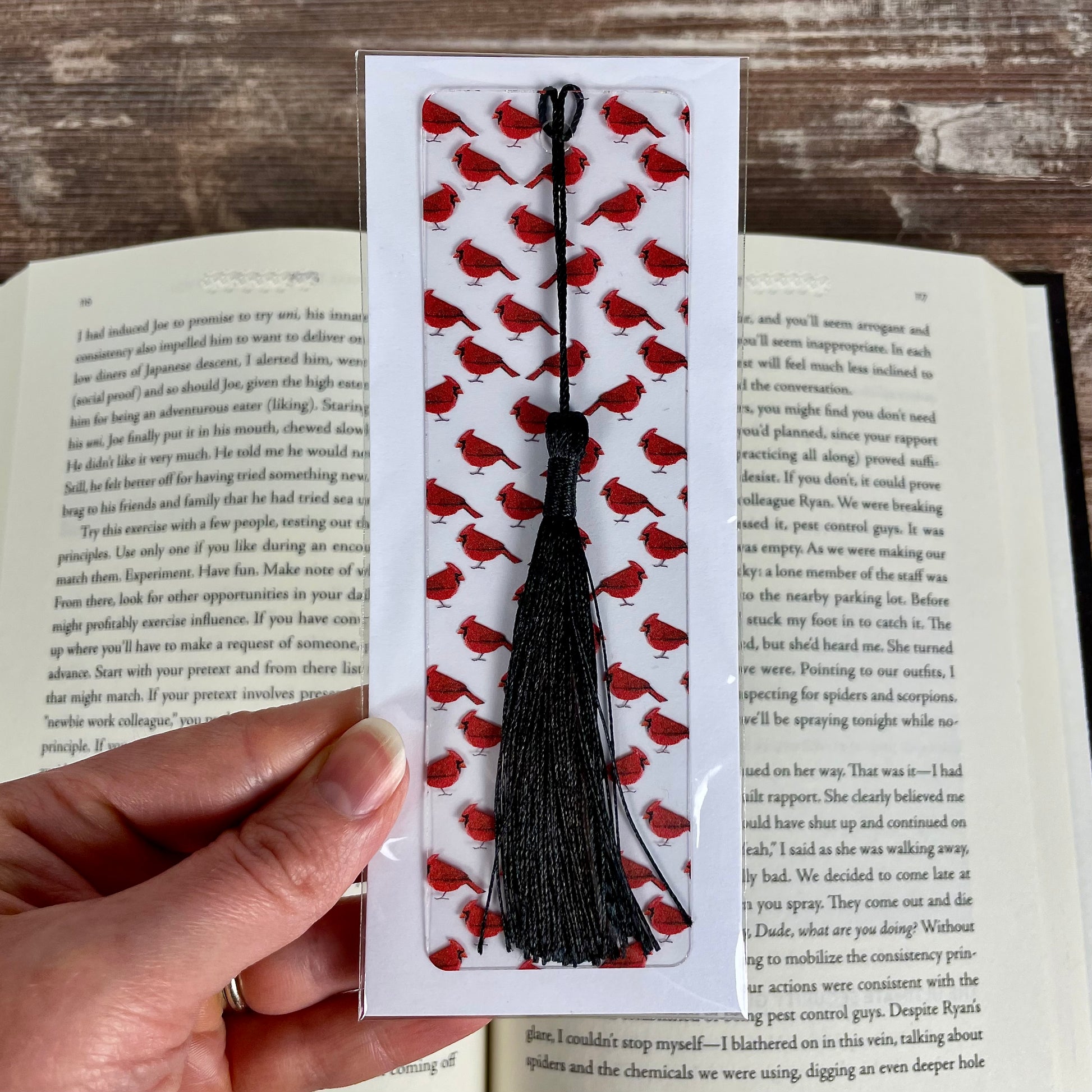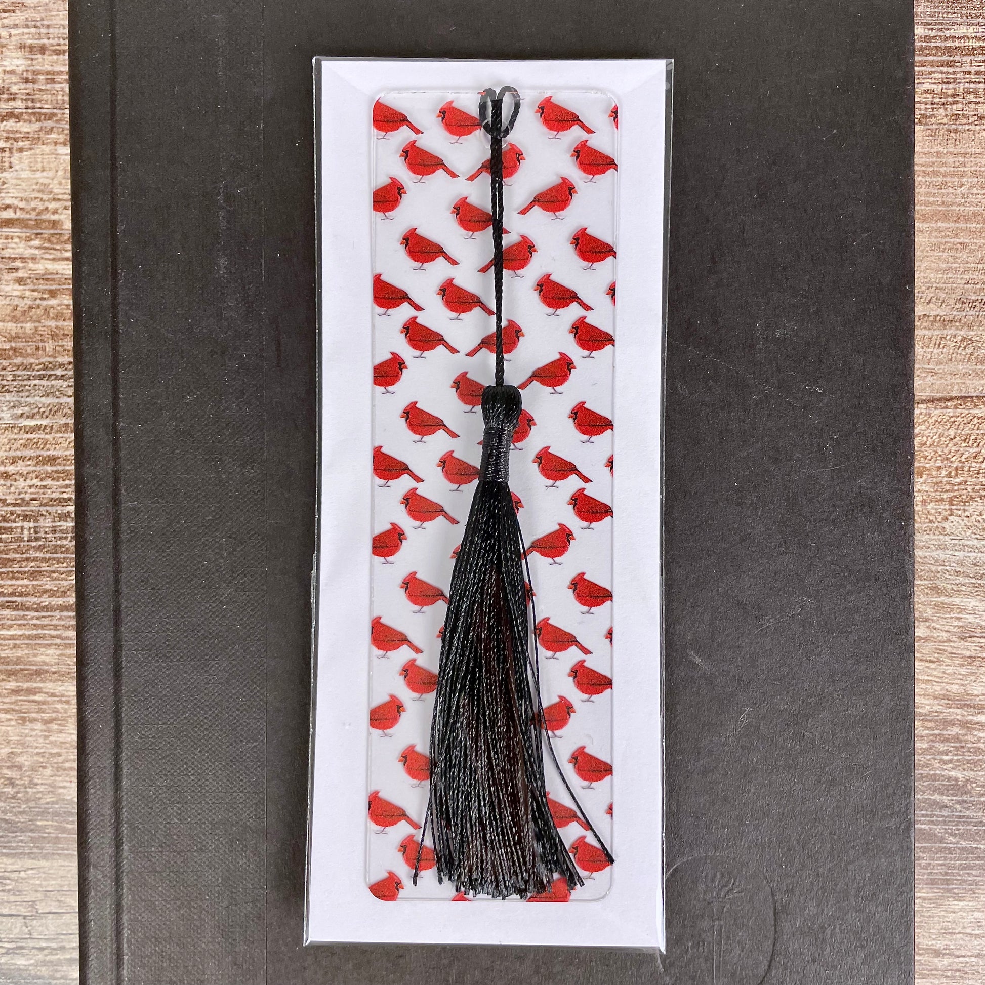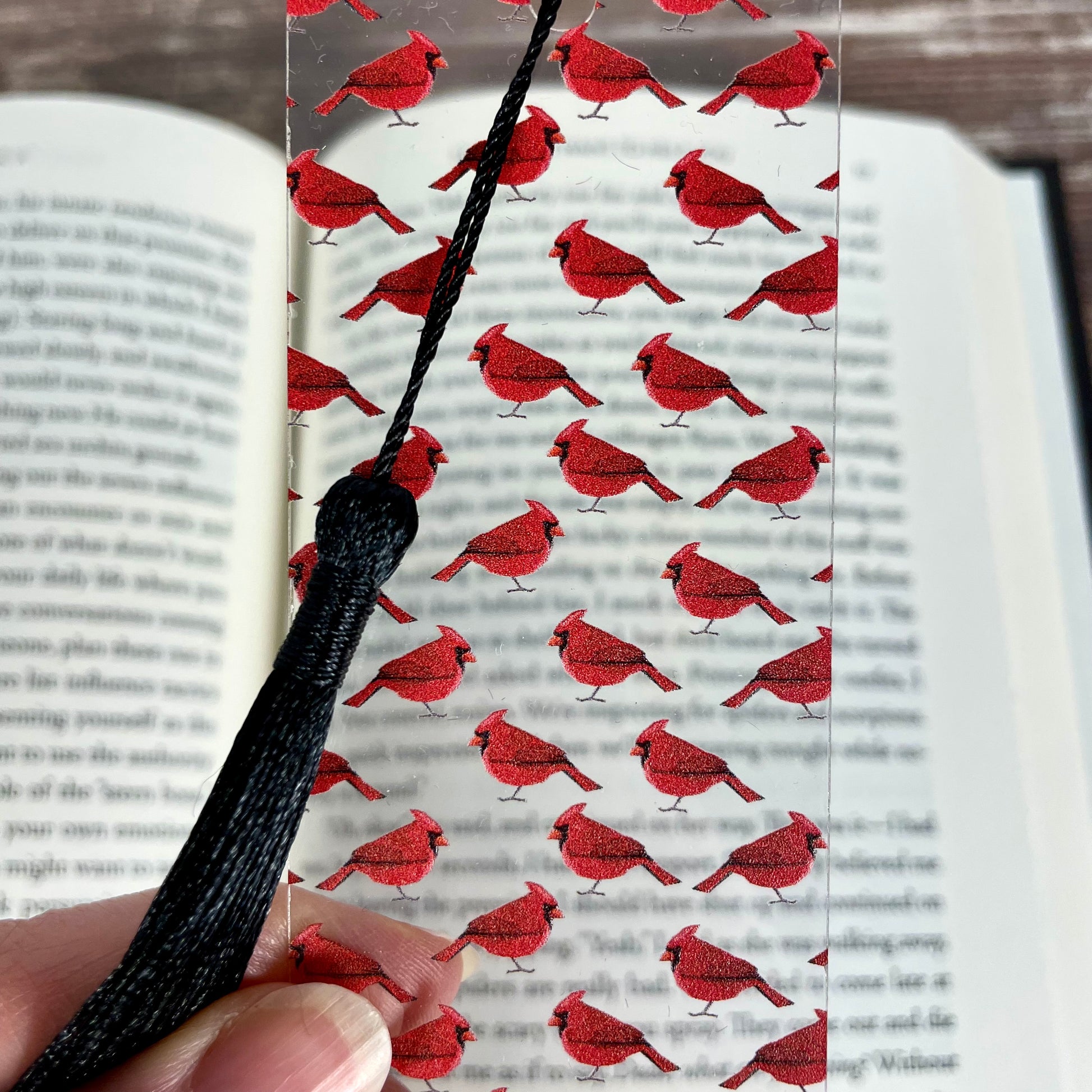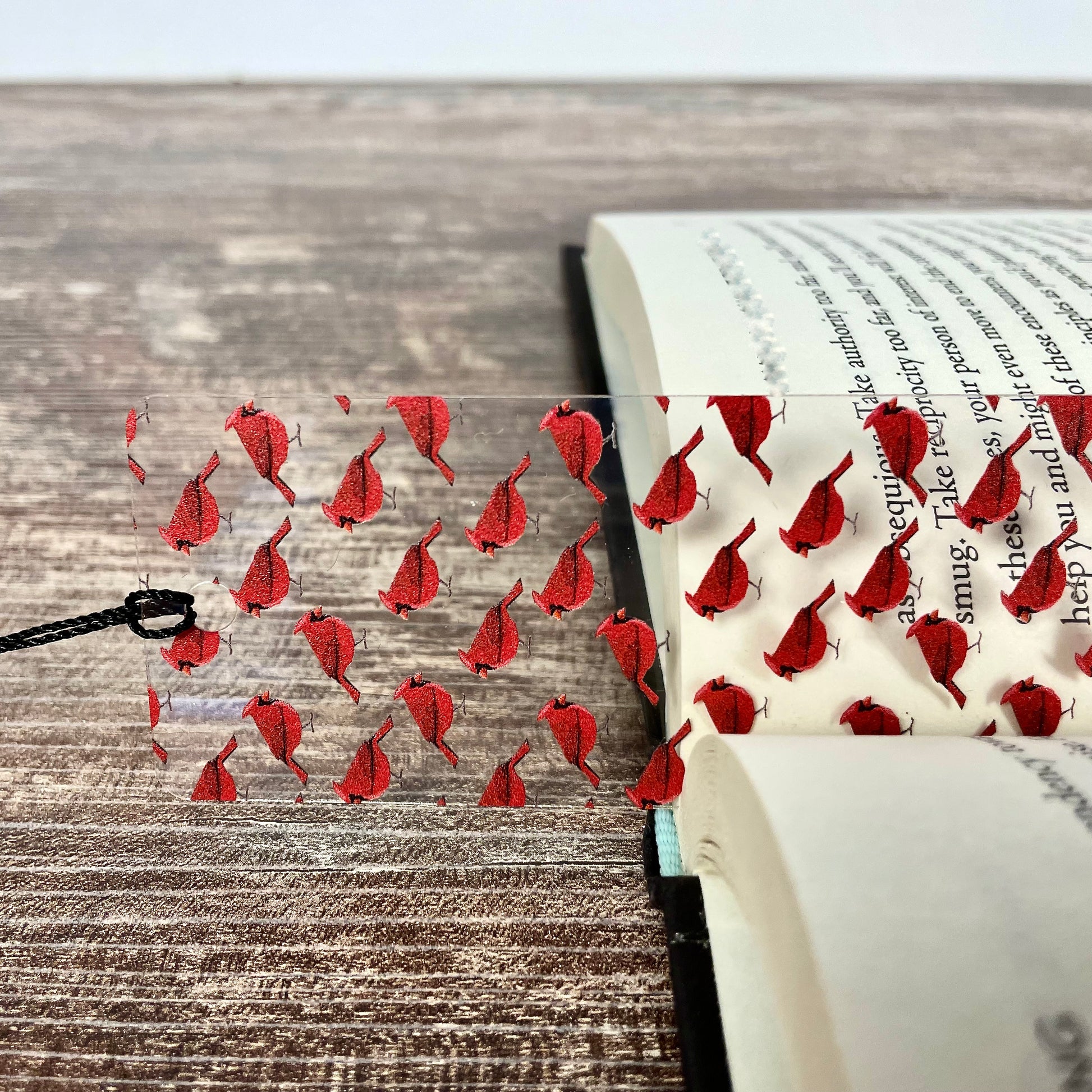Clear, flexible bookmark with bold red cardinal pattern
