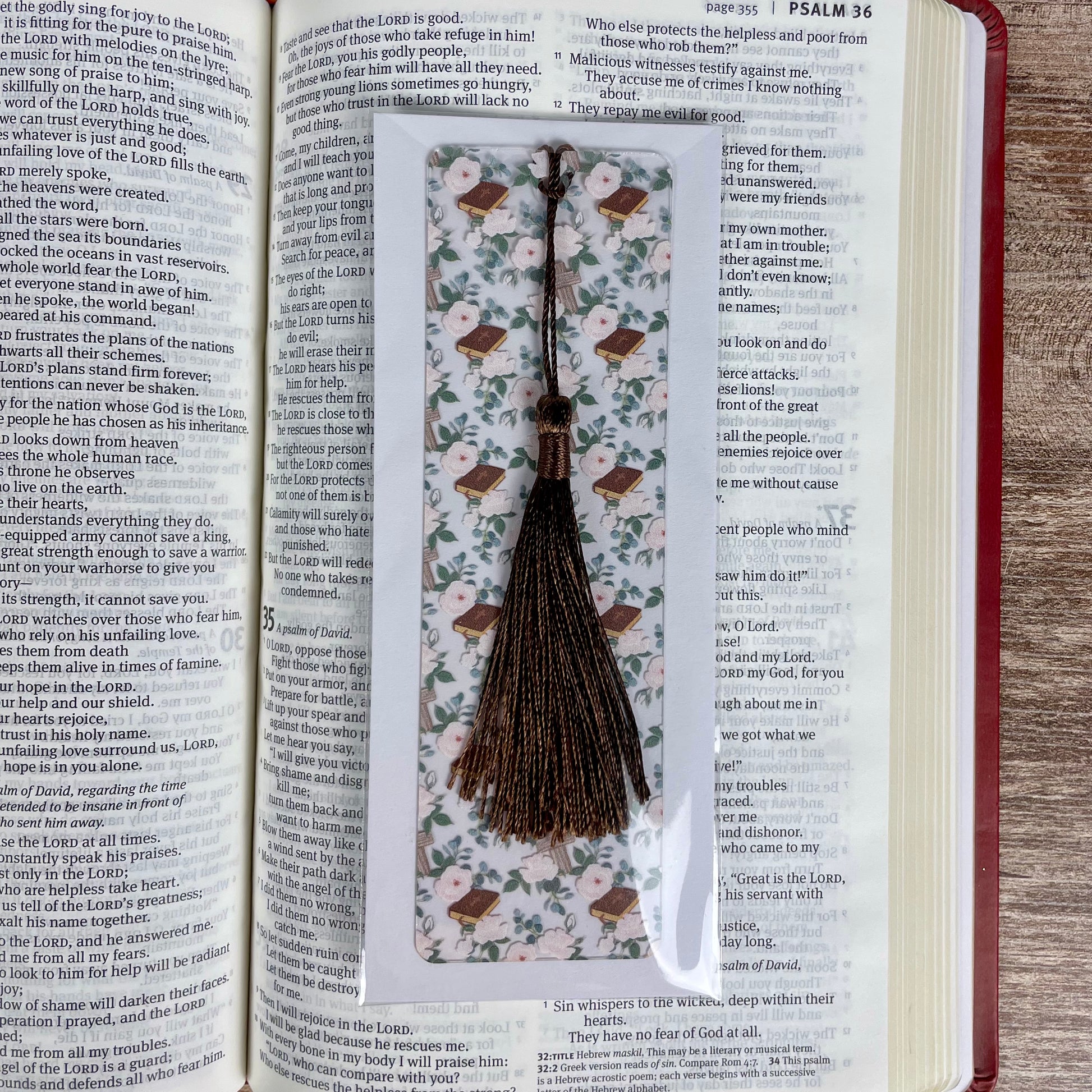 A unique and heartfelt bookmark that combines faith, flowers, and a love of books.