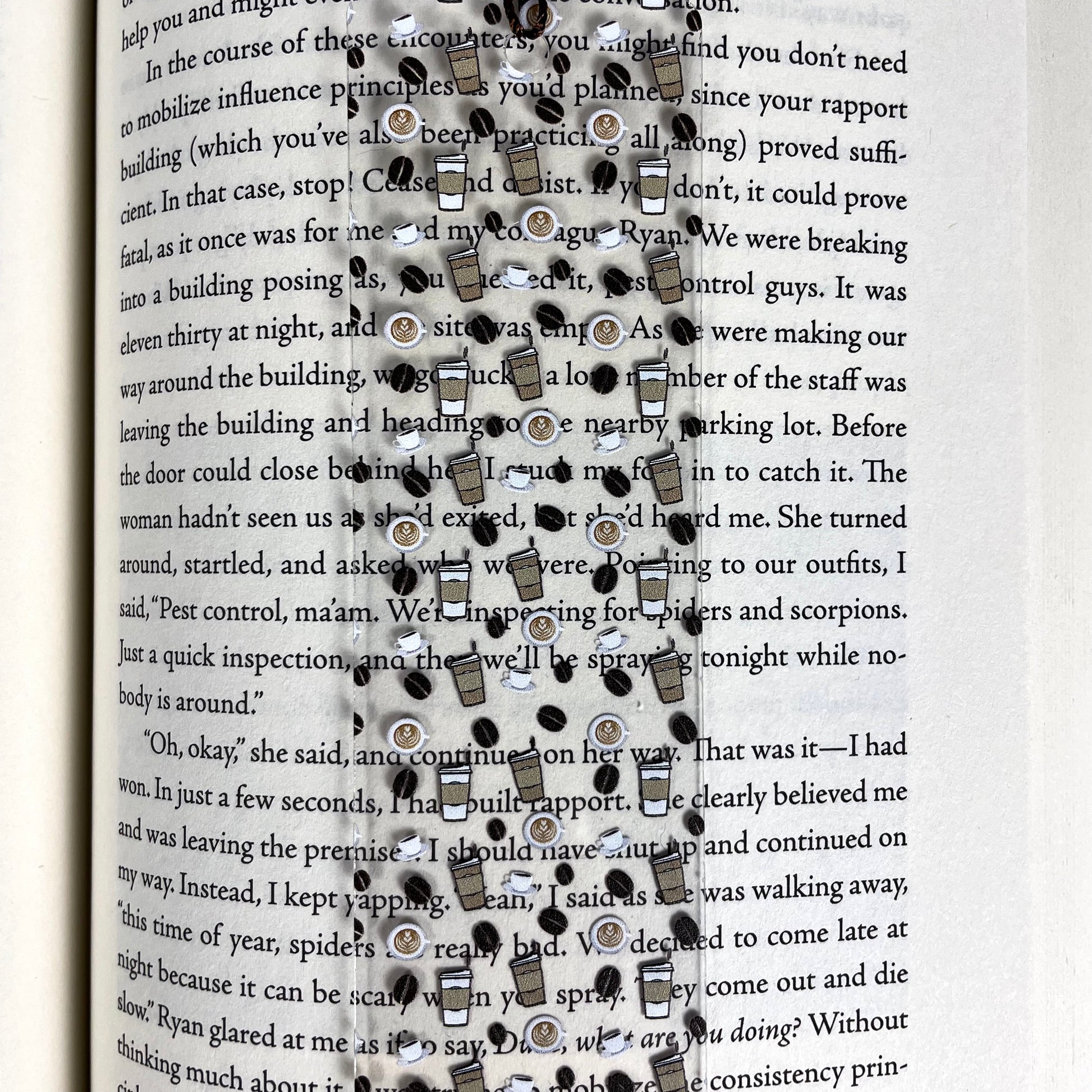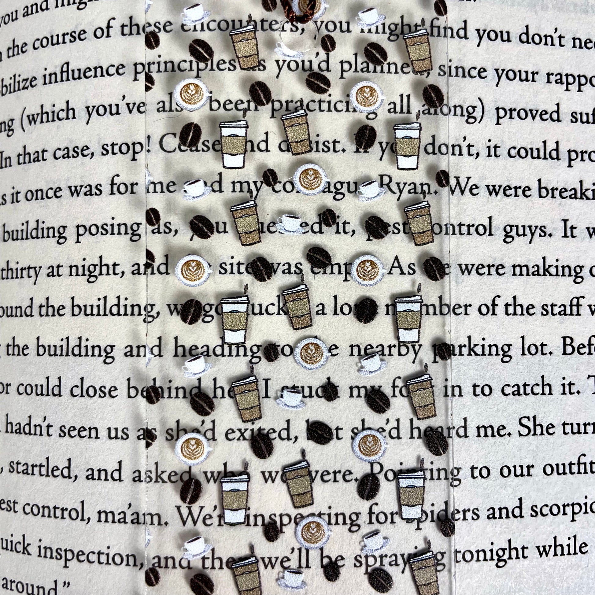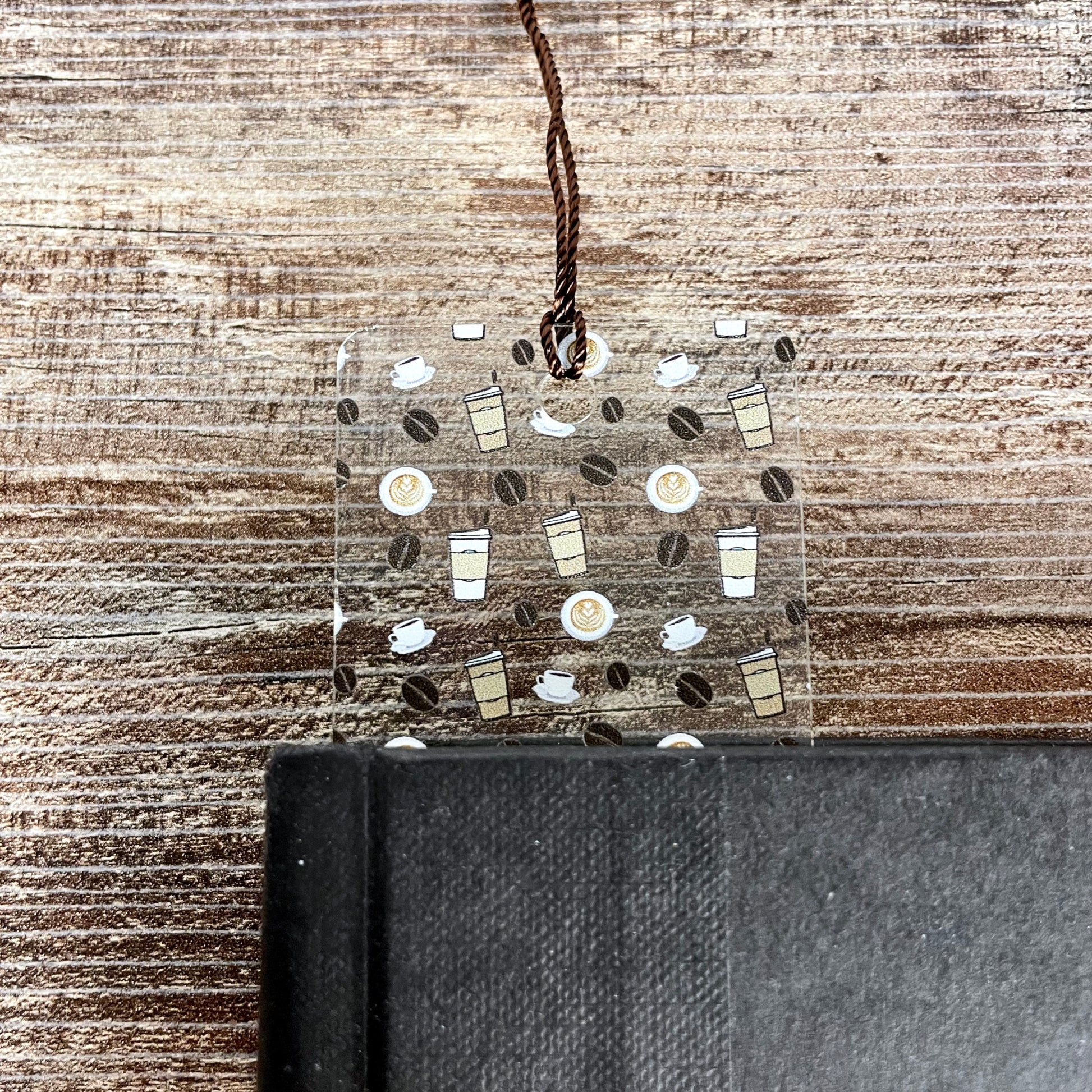 Clear, flexible bookmark with coffee design