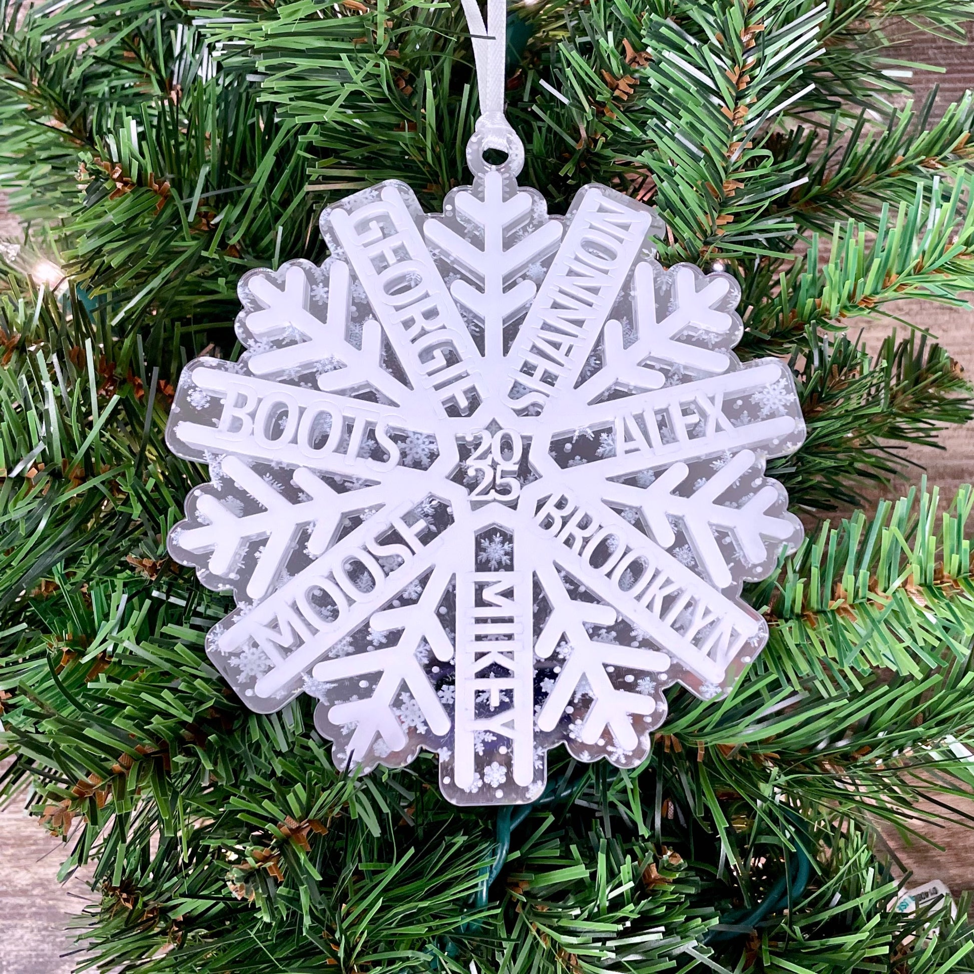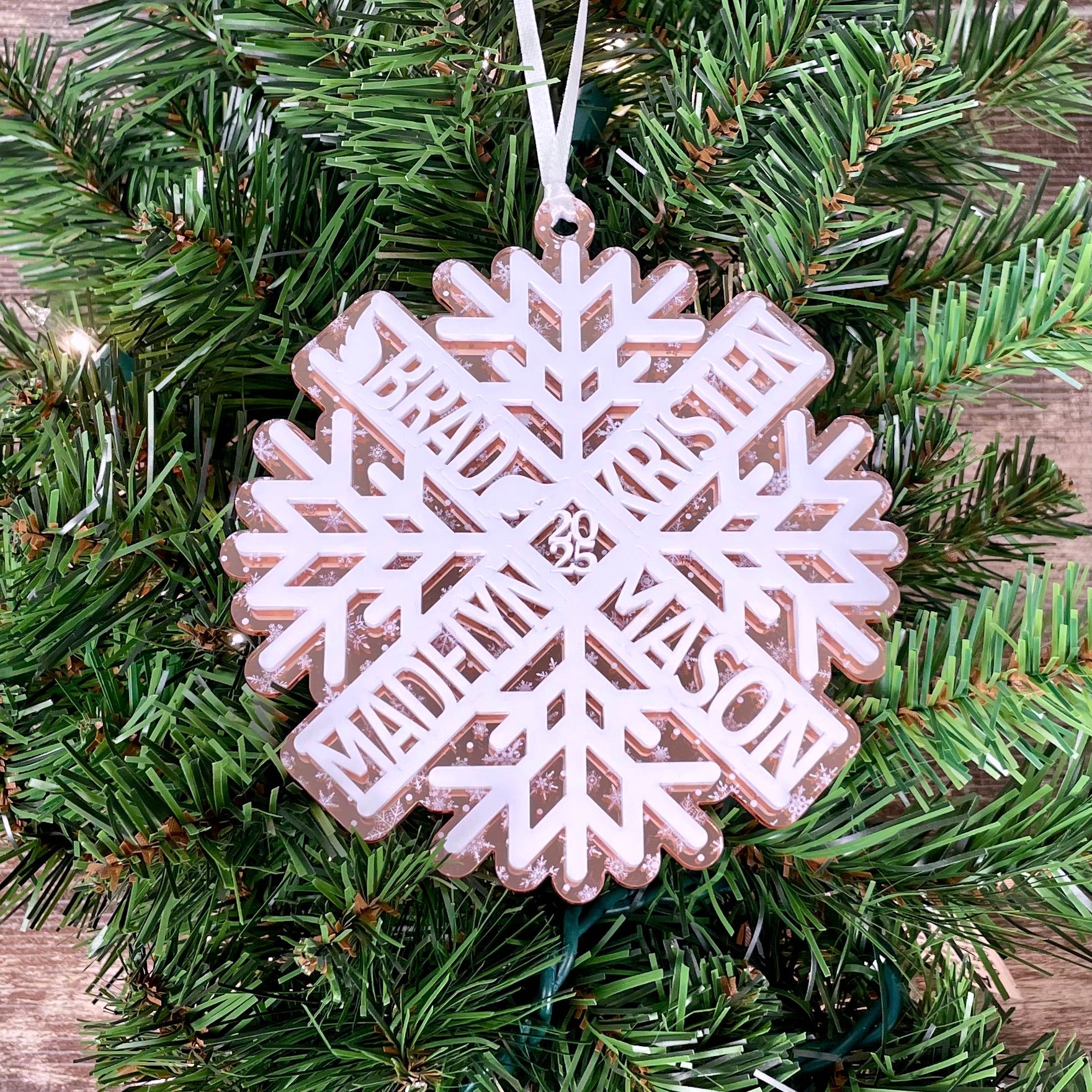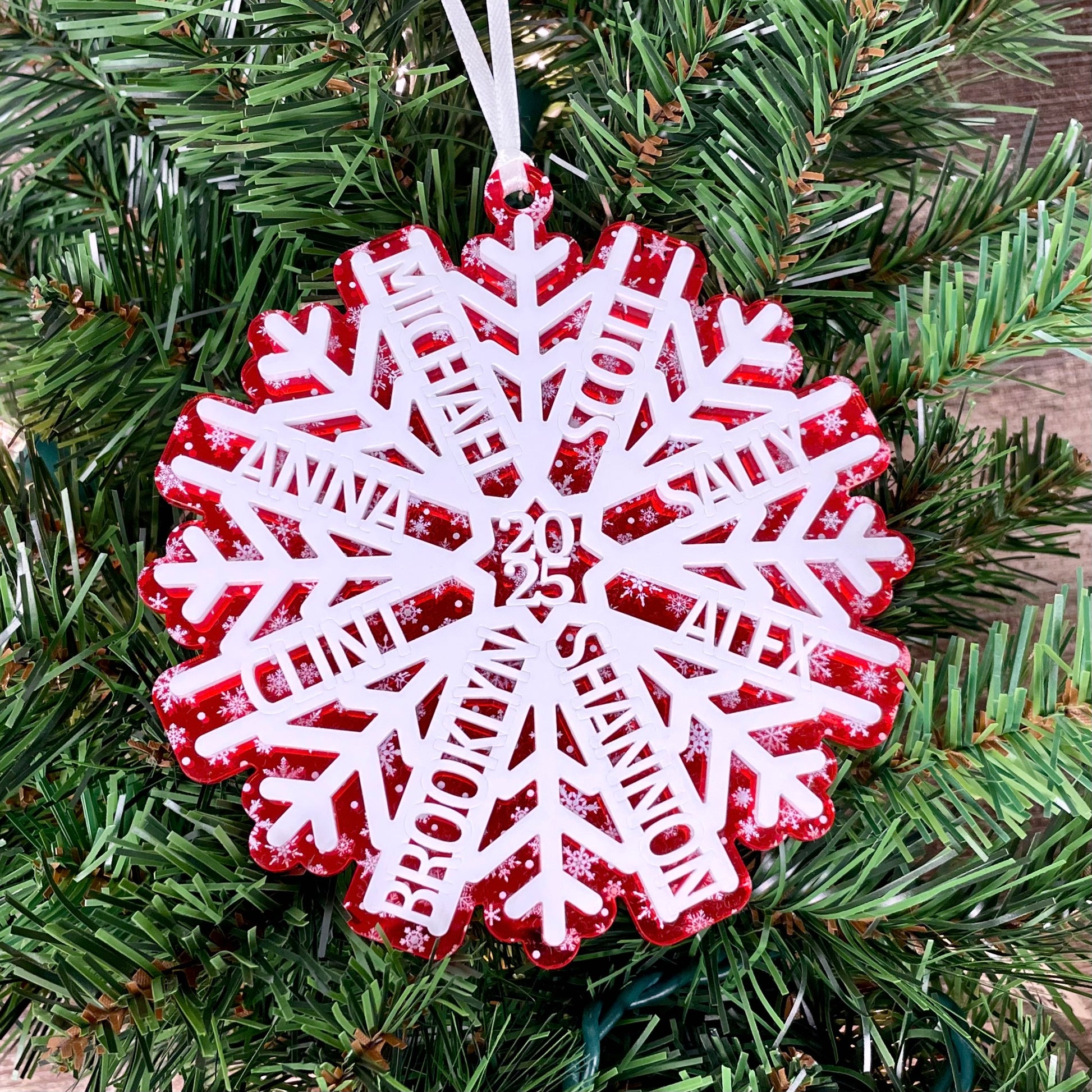 Each ornament is custom-made from layered acrylic, featuring a dazzling snowflake backer and a crisp white acrylic top with your family’s names.
