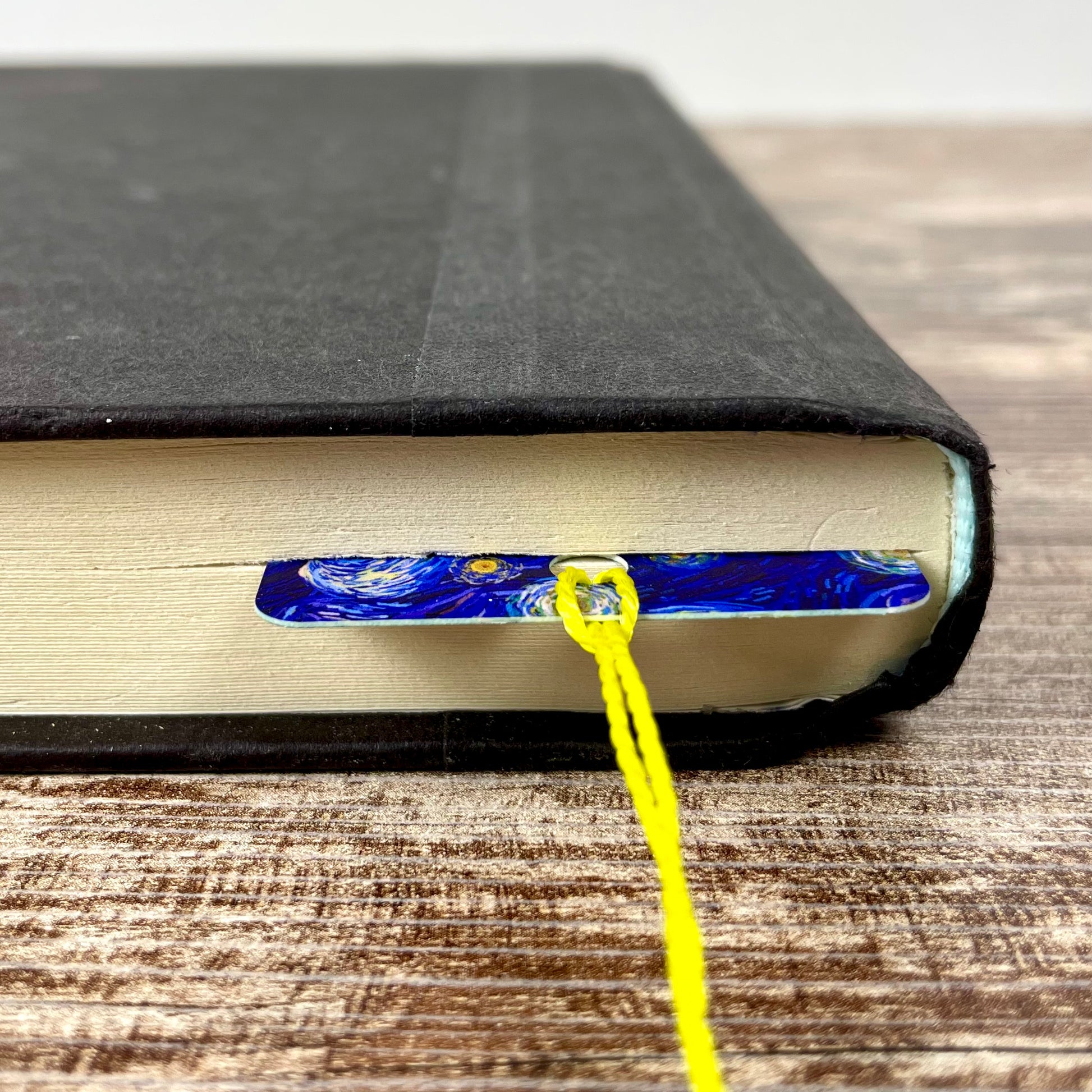 This bookmark features a stunning Starry Night design — vibrant blues, swirling skies, and a pop of yellow tassel that brightens every read.